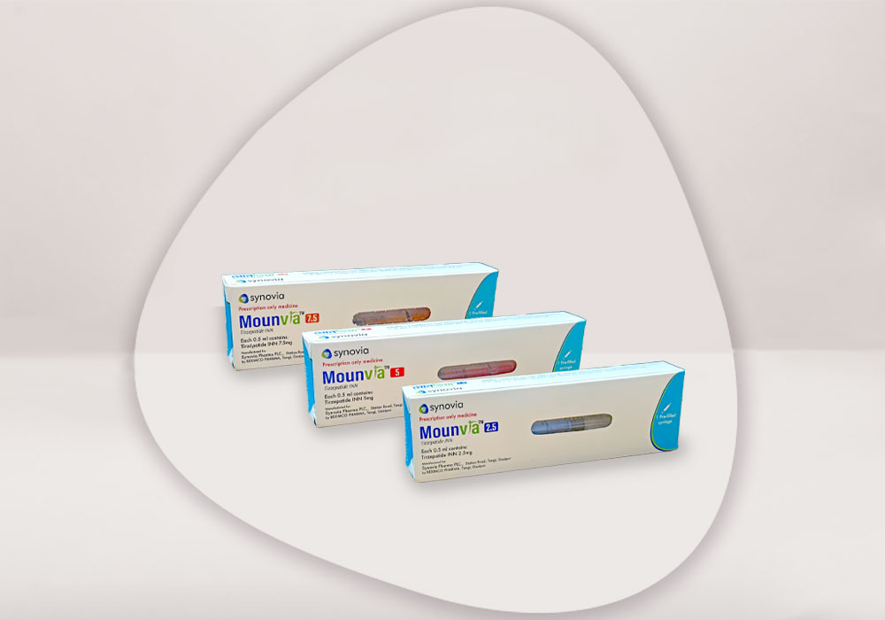 Mounvia® contains Tirzepatide, a dual incretin receptor agonist used for type 2 diabetes and weight management. It helps improve blood sugar control, enhance insulin response, and support significant weight loss when used under medical supervision.